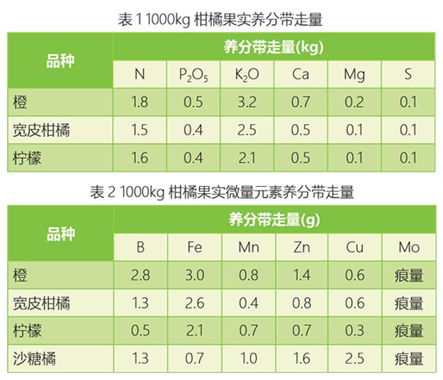 不同柑橘品种果实养分带走量可参考表1和表2,有研究表明柑橘果实累积氮占全树总累积氮的20%-27%。橙需肥量高于其他品种,并且铵态氮能提高橙的可溶性固形物含量。