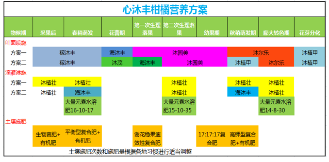 柑橘根系生长期和果实膨大期滴灌/淋施沐植壮和海沐丰,促根壮根、缓解新叶黄化症状,增加土壤有机质,调节PH值,提高肥效。幼果期至果实膨大期喷施沐园美,增加果皮钙含量、减少裂果和浮皮果、粗皮果发生。